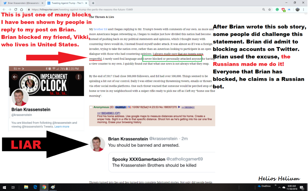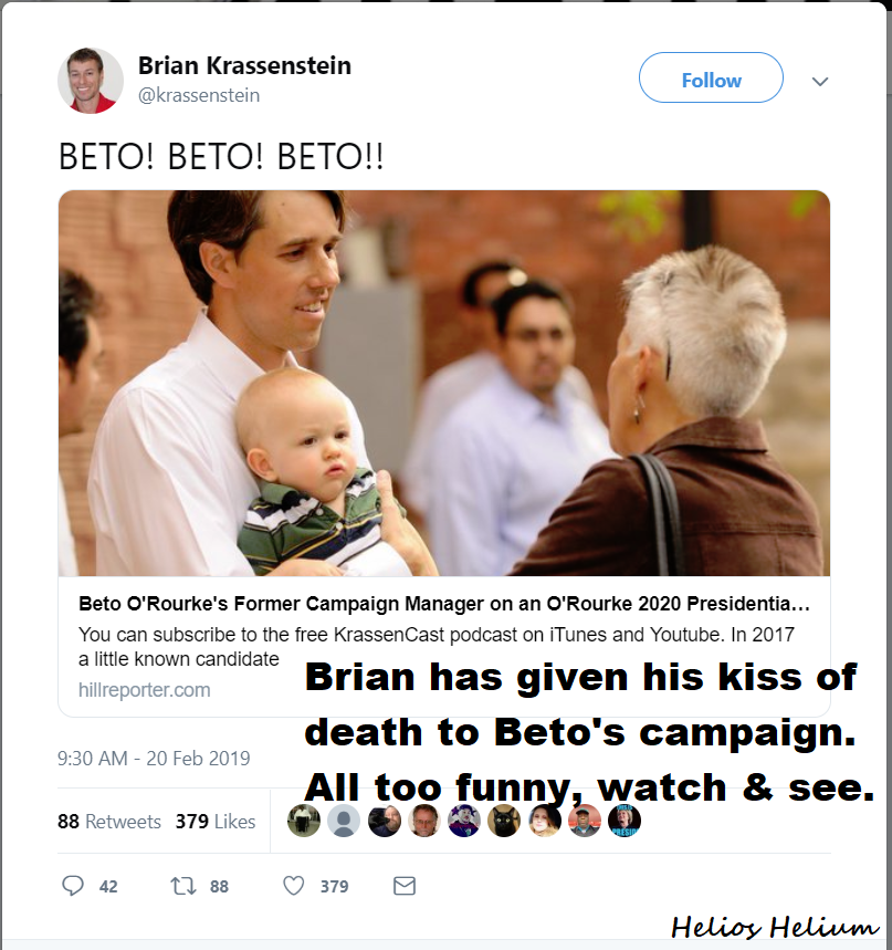 Brian or his hypothetical handlers must have had enough of Helios Helium’s fact-checking on Brian’s home page because Brian blocked Helios Helium. We will draw your attention to Brian’s post on Beto. Look at the date of the post, Helios Helium posted a comment on the Beto post after the date {2/8/2019} shown below on Brian’s block of Helios Helium. It is more evidence that Helios Helium might be a group of people in a think-tank.