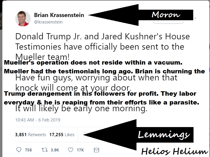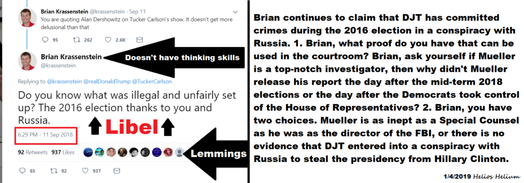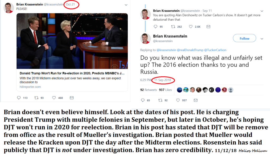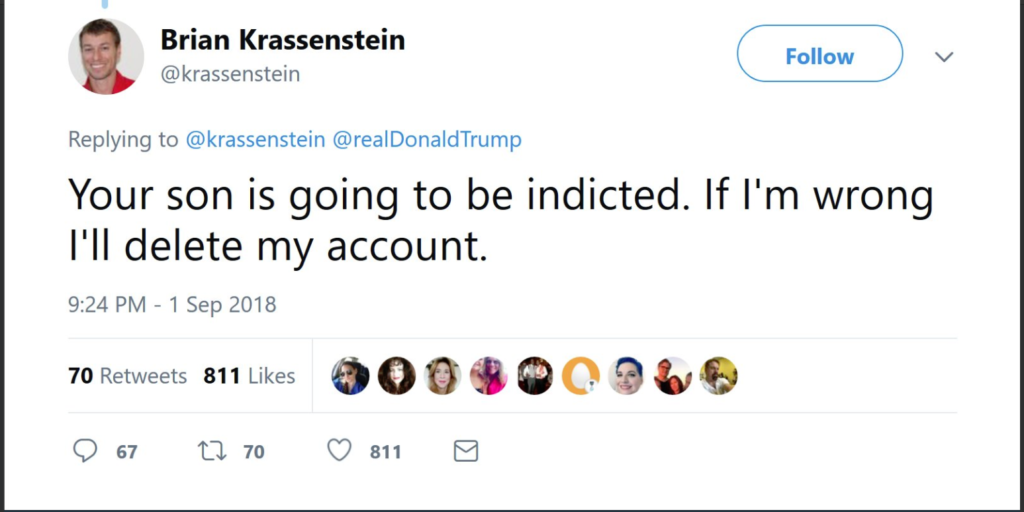 It is interesting that Brian did not put a due date on this post of his. Brian and his brother, Ed, have posted that the day after the 2018 mid-term elections Mueller would indict both President Trump and Don Jr. Now we are supposedly seeing smoke signals from the Justice Department that Mueller will close his investigation next week and file his report with Attorney General Barr. If that happens, we would ask you to revisit this article and take a screenshot of Brian’s post below if you have a Twitter account. We ask you to hold him accountable for his promise.
