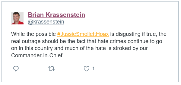 We are most disturbed by Brian’s post below. Brian skips over the fact that Smollett committed a crime by filing a false report with Federal Officials and the local police department. He also doesn’t address the possible damage done to race relations. Then there is the crying wolf factor. If MAGA hat wearing individuals were to do a similar action against a minority, the victim might be unjustly not believed. Brian is flat out lying about the President stoking the commission of hate crimes. See our article on this topic>https://dcdocumentreports.com/elementor-411/ We will point out that Brian wrote (stroked) instead of (stoked) which is the correct word usage in this sentence. Brian’s bio states he is a college graduate and he is a journalist. Keep that in mind as we present his other posts. One might think that English isn’t Brian’s first language. Of course, the best agents are the native-born citizens in the target country. UPDATE: Smollett has been charged for making a false criminal report to the police. A felony charge that carries a sentence of three years in prison.
